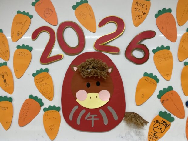 今年は、午年ということで学童の壁面にも一頭のお馬さん(生みの親は5年女子Kさん:一生懸命作ってくれました🐴)がやってきてくれています。このお馬さんは、子どもたちの夢や希望をかなえてくれます。